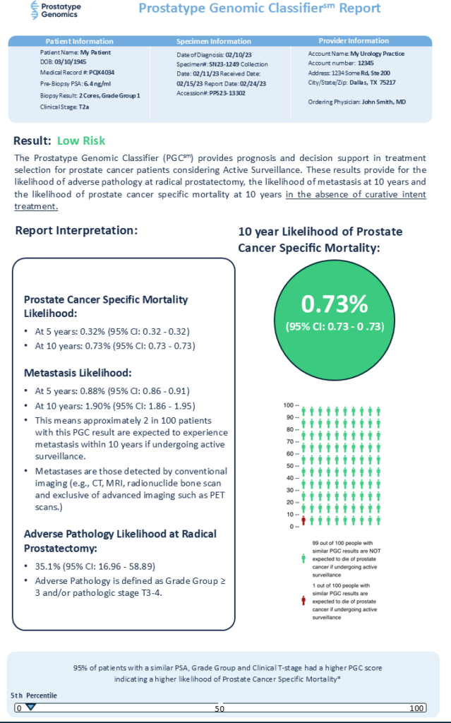 The test results from the genetic analyses are combined with PSA, Gleason score, and tumor stage to calculate a P-Score. The P-Score measures how aggressive or non-aggressive the cancer is. This combination of genetic and clinical data provides a comprehensive picture of the cancer’s nature and helps guide treatment decisions.